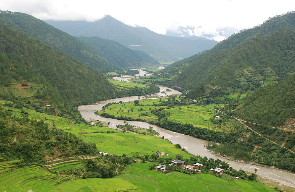 A short drive through the Punakha valley, we begin our hike crossing the suspension bridge and ascending a series of switchbacks to Khasum Yueley Namgyal Temple. From this temple, there is a grand view of the Mo Chhu (Female River) valley below. We then descend from the temple and follow a well-worn path down the valley through rice fields and small villages. Along the way we are rewarded with stunning views – the terraced rice paddies providing an exotic backdrop to the river below.