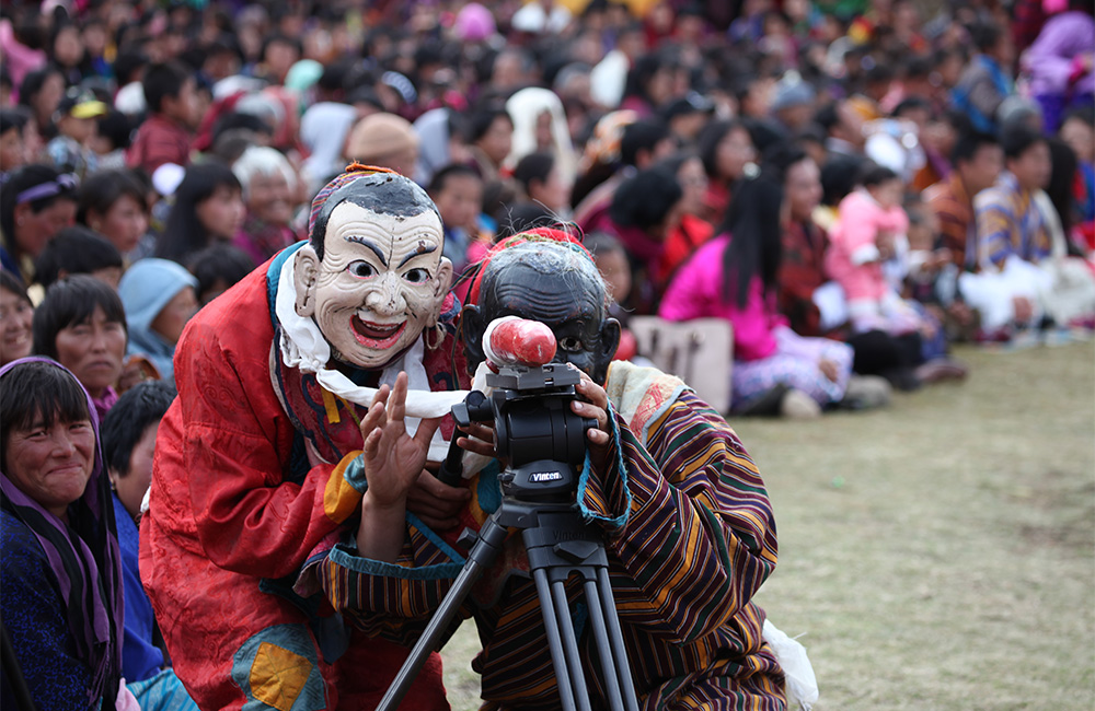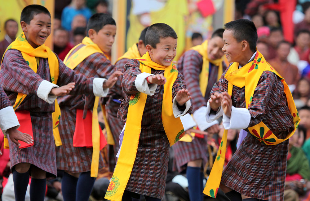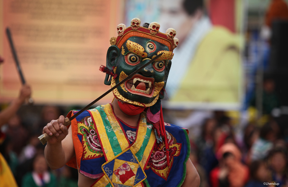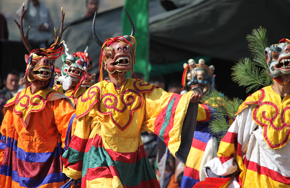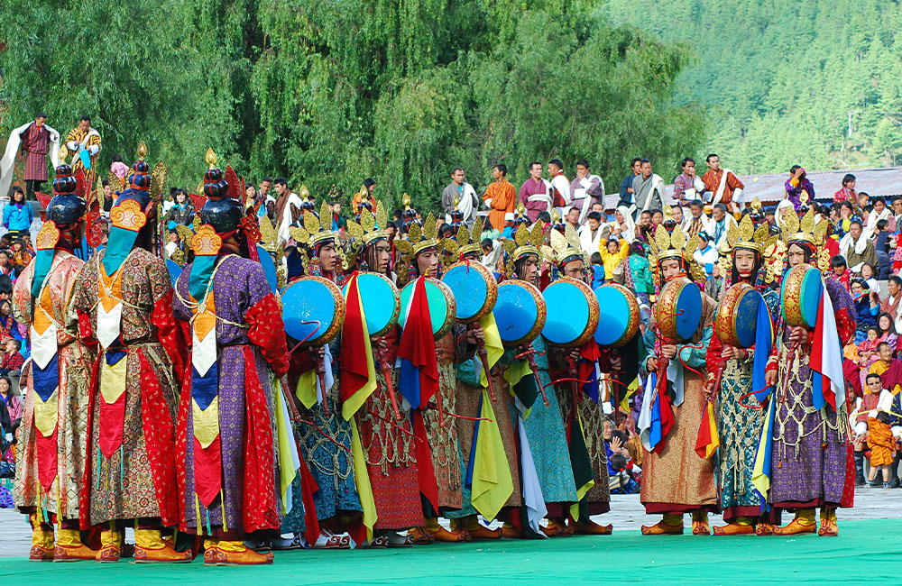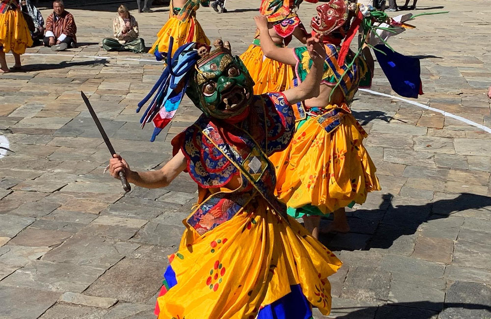 The Paro Tshechu / Festival in the spring is a wonderful time to visit Bhutan, experience its ancient culture, and get enthralled in the celebrations. Amid blossoming flowers and lush green landscape the Festival comes alive with vibrant colors, music, dances and other sacred rituals. Mask Dance and music plays an important role in the cultural life of Bhutanese people and are performed to convey religious messages and righteous ways of living to the people.